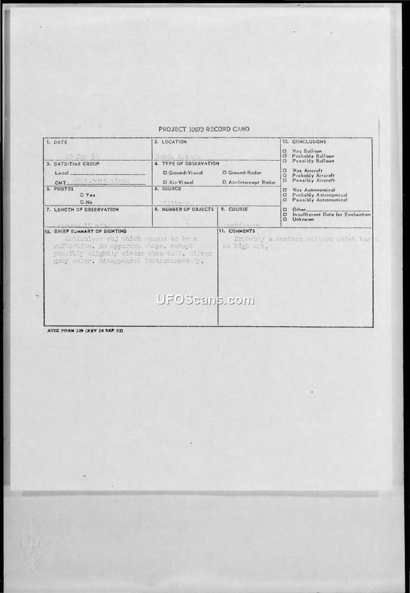 Project 10073 Record Card and Incident Report — Reno, Nevada, 12 June 1959