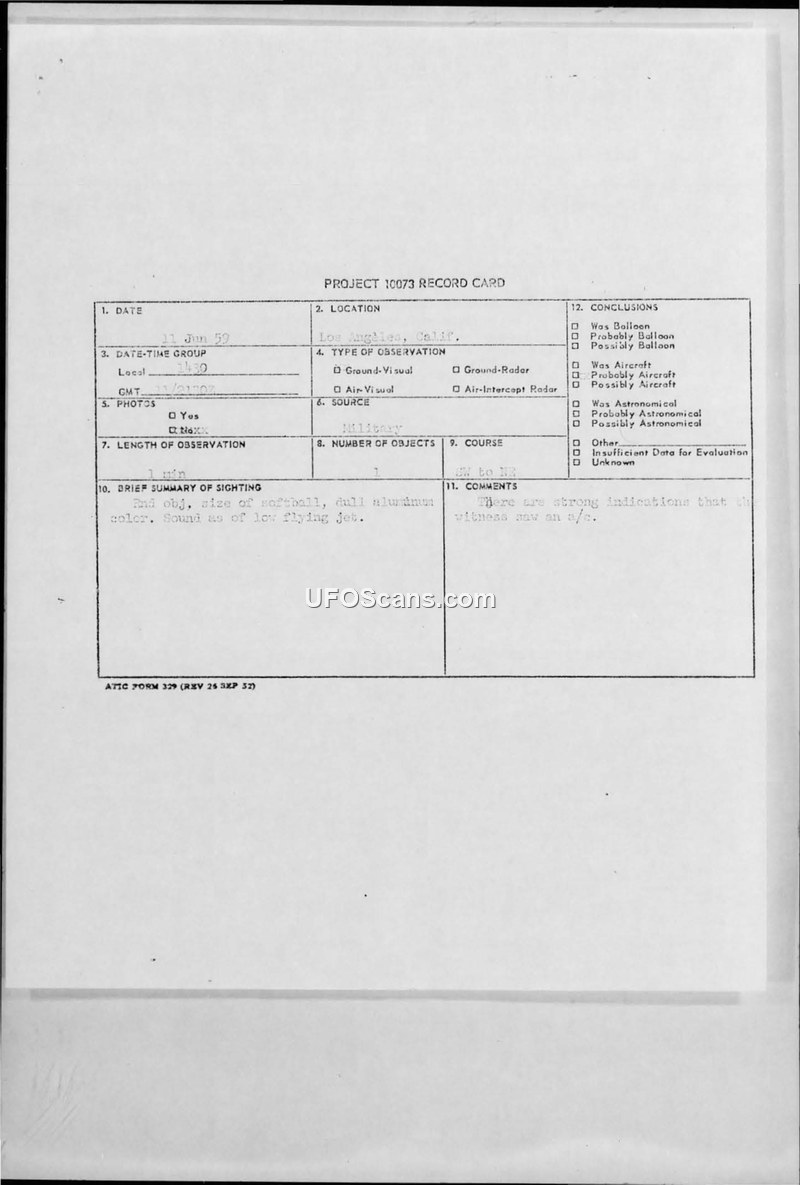 Project 10073 Record Card - Los Angeles, Calif. - 11 Jun 59