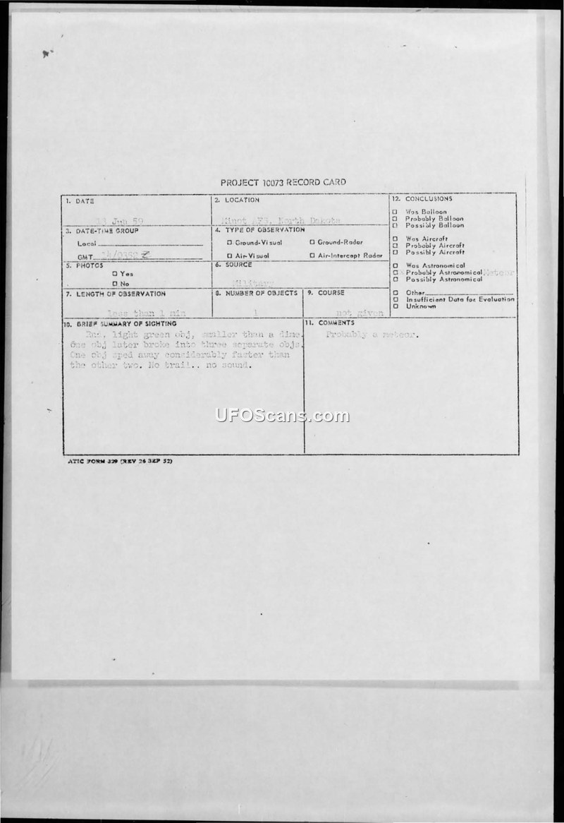 A 1959 sighting report from Minot AFB describes a light green, round object that split into three parts and dove toward the horizon. The official conclusion attributed the event to a meteor.
