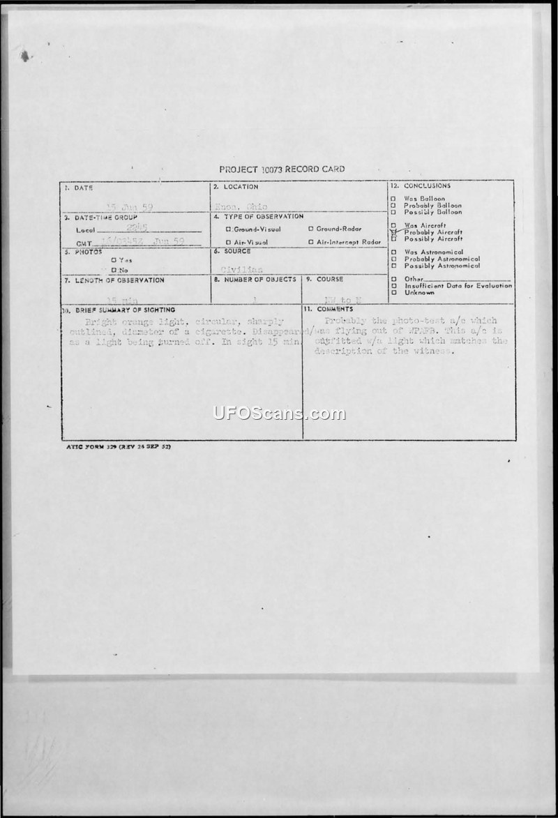 Project 10073 Record Card — Enon, Ohio, 15 June 1959