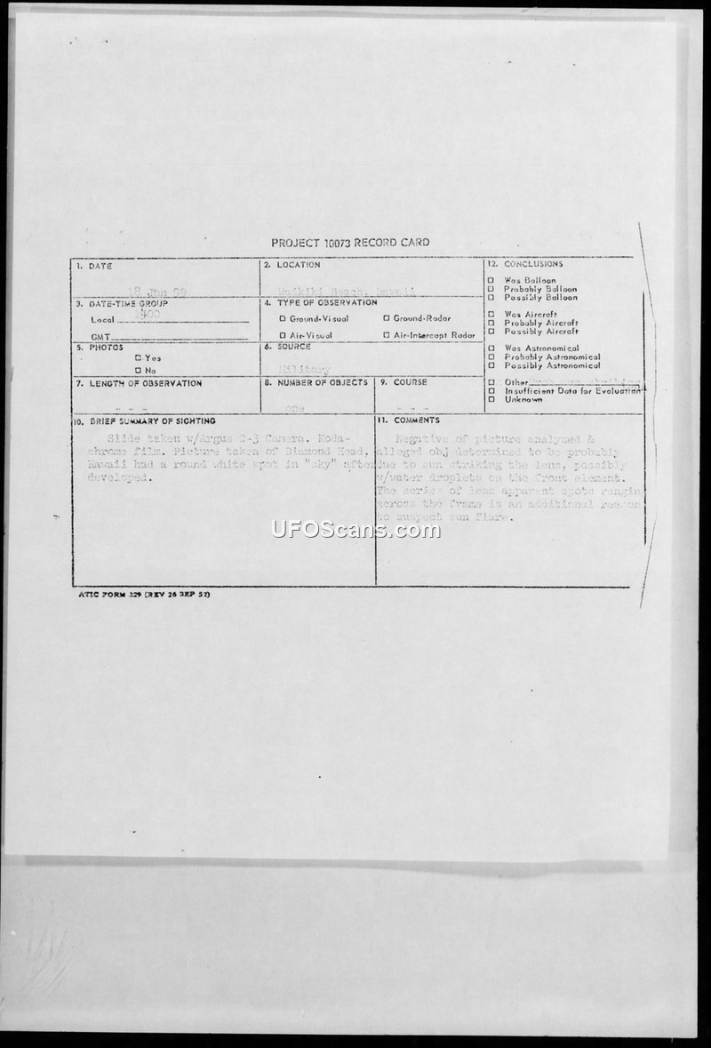 A photographic anomaly captured in Hawaii in 1959 was investigated by the Air Force. Analysts concluded the 'UFO' was a sun flare effect on the camera lens.
