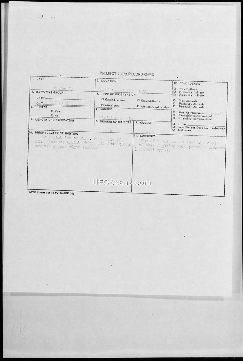 On 18 June 1959, at approximately 1215Z, the pilot of a United Airlines Flight 36, flying over the Pacific Ocean at 19,000 feet, observed a phenomenon he initially reported as a rocket firing. The pilot described seeing four round, intense bluish-white globes of fire, arranged in two rows of two, moving in a straight line. The objects were visible for approximately two seconds before disappearing. The pilot estimated the objects were 30 miles away and traveling at a high rate of speed. A second pilot from a Transoceanic Airlines flight, located approximately 120 miles to the west, also reported seeing the objects at the same time. The United Airlines pilot attempted to contact a surface vessel he believed was in the area, but received no confirmation of a missile launch. Subsequent investigations by the Air Force, including coordination with the Western Sea Frontier and the 28th Air Division, failed to identify any USN or USAF missile firings in the area at that time. The Air Force conducted an exhaustive study of the report, noting that the sighting occurred in a sensitive area where military officials were expecting a Russian ICBM test. The final evaluation concluded that the objects were, in all probability, a meteor. The report notes that the pilot's estimates of distance and speed—if taken literally—would suggest a velocity of approximately 14,500 miles per hour, consistent with a ballistic missile. However, the Air Force argued that if the observer had underestimated the distance, the data would align with meteor velocities. The description of the objects, including their colors and luminosity, was determined to match the characteristics of a classic fireball.