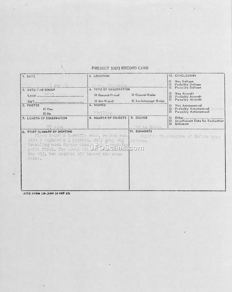 The witness reported a loud, roaring object that appeared to be a tumbling, dull gray, pyramid-shaped craft. The Air Defense Command forwarded the report to ATIC for evaluation, noting that the initial information provided was insufficient for a valid conclusion.