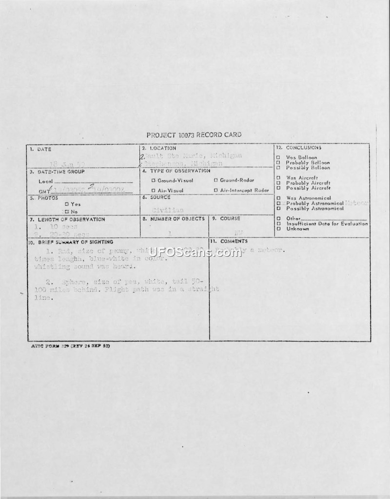 Project 10073 Record Card and UFO Report — Sault Ste. Marie, Michigan, June 1959