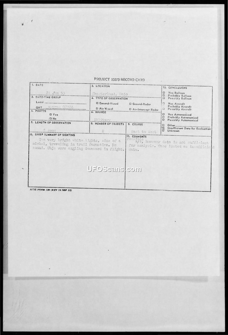 A military officer reported observing two bright, fast-moving objects in Chesterland, Ohio, on June 21, 1959. The incident was recorded under Project 10073 but was ultimately classified as having insufficient data for analysis.