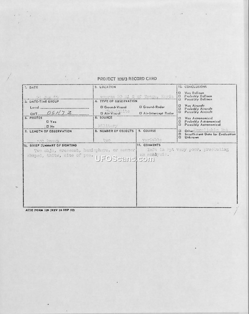 Project 10073 Record Card and UFO Report — Taegu, Korea, 25 June 1959