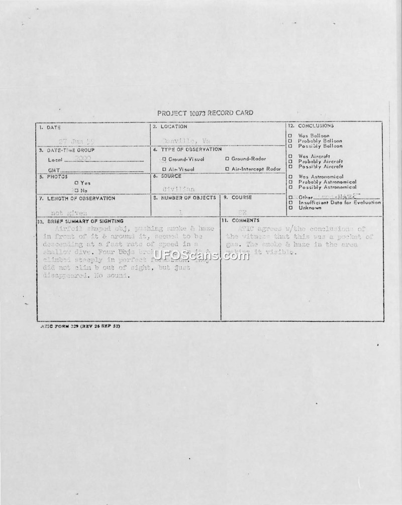 A civilian witness reported a four-object formation sighting in Danville, Virginia, in 1959. The Air Technical Intelligence Center (ATIC) officially concluded the event was a pocket of gas.