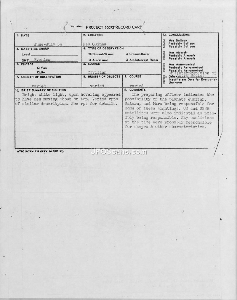 This report details a series of UAP sightings in Boianai, New Guinea, in 1959, involving multiple witnesses who claimed to see humanoid figures on craft. Official investigations concluded the sightings were likely natural phenomena, such as planets and atmospheric effects, rather than extraterrestrial craft.