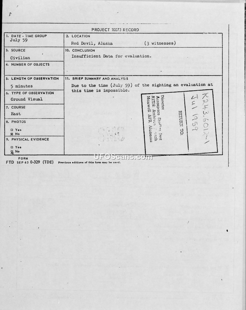 A civilian report of an unidentified aerial object in Red Devil, Alaska, from July 1959. The Air Force concluded that the two-year delay in reporting rendered the case impossible to evaluate.