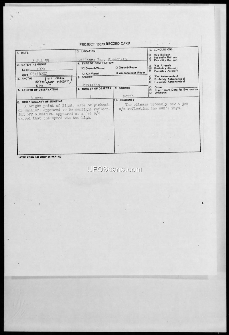 Project 10073 Record Card — Williams Bay, Wisconsin, 3 July 1959