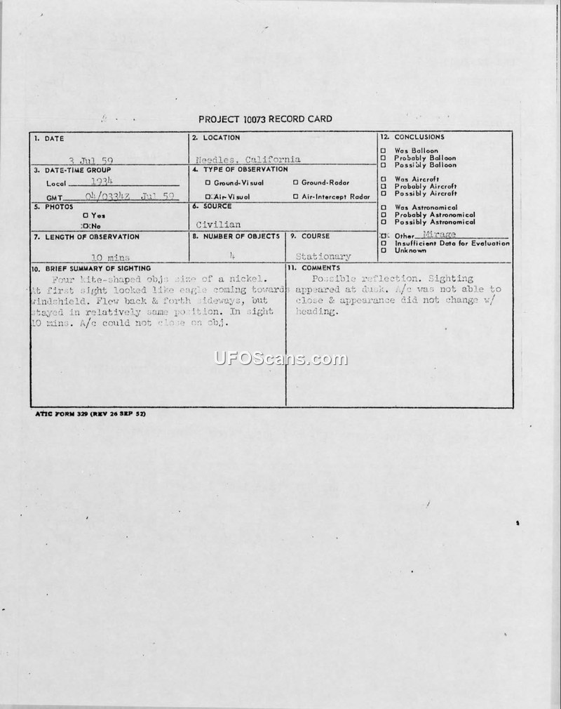This document contains a Project 10073 record card and associated incoming military messages regarding a UFO sighting that occurred on July 3, 1959, near Needles, California. The witness, identified as the Aviation Director of the State of Washington, was piloting a Piper Comanche at an altitude of 10,500 feet when he observed four kite-shaped objects that appeared to be the color of nickel. The objects were initially described as looking like an eagle approaching the windshield. The pilot reported that the objects flew back and forth sideways but remained in a relatively stationary position relative to his aircraft. The sighting lasted for approximately ten minutes, during which the pilot attempted to close the distance to the objects but was unsuccessful. The objects eventually disappeared as darkness fell. The official conclusion reached by the Air Force was that the sighting was likely a mirage or reflection caused by the rays of the setting sun passing through dust particles. The document also includes a separate, unrelated memorandum from July 24, 1959, regarding unidentified objects in the South China Seas, which discusses potential explanations such as submarine activity, Chinese fishing sampans, or giant manta rays.