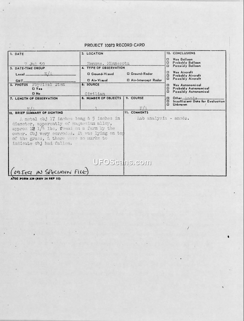 A metallic object found in Minnesota in 1959 was investigated by the Air Force and identified as a magnesium anode used for pipeline corrosion prevention. The Air Force concluded the object did not originate from a flight or fall and denied public requests for samples or further data.