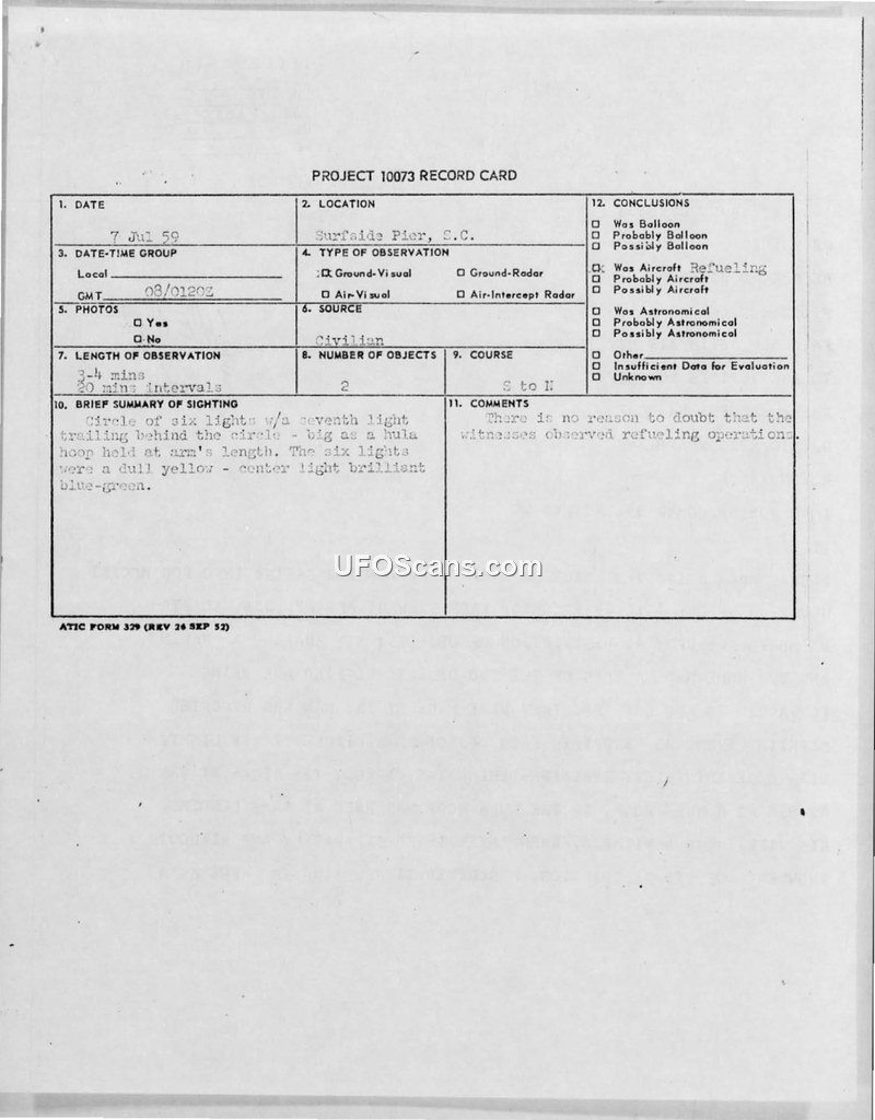 This document consists of a Project 10073 Record Card and a series of teletype messages regarding a UFO sighting reported on July 7, 1959, near Surfside Pier, South Carolina. The primary witness, a medical doctor, reported observing two objects while on the beach with relatives. He described the objects as circles of six lights with a seventh trailing light, comparing their size to a hula hoop held at arm's length. The witness reported that the objects made four passes over the observers, maintaining a constant formation, and that on the fourth pass, he observed an explosion-like flash, after which the configuration changed to four smaller solid circles of light. The objects then hovered in a square pattern before two of them accelerated inland at an enormous rate of speed. The witness emphasized that there was no sound associated with the objects. The report includes details of the witness's background, noting that he was a mature, sober individual who hesitated to report the sighting for fear of being considered a crank. Military intelligence at Myrtle Beach AFB investigated the report and noted that at the time of the sighting, eight F-100 aircraft were performing refueling missions with two KB-50 tankers in the vicinity. The 727th AC&W Squadron reported no unusual radar activity. The preparing officer concluded that the objects were likely the KB-50 tankers refueling the F-100 aircraft, though the witness maintained he had never seen an aerial refueling operation. The document includes references to drawings and home-made slides provided by the witness to the Air Technical Intelligence Center (ATIC).
