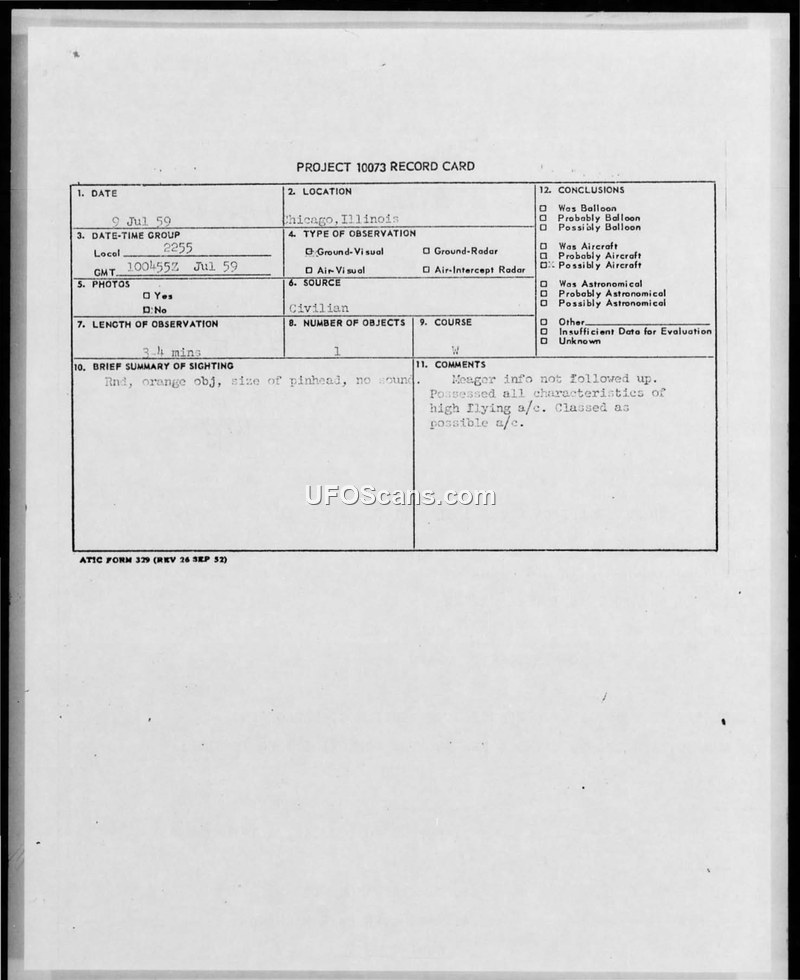 Project 10073 Record Card — Chicago, Illinois, 9 July 1959