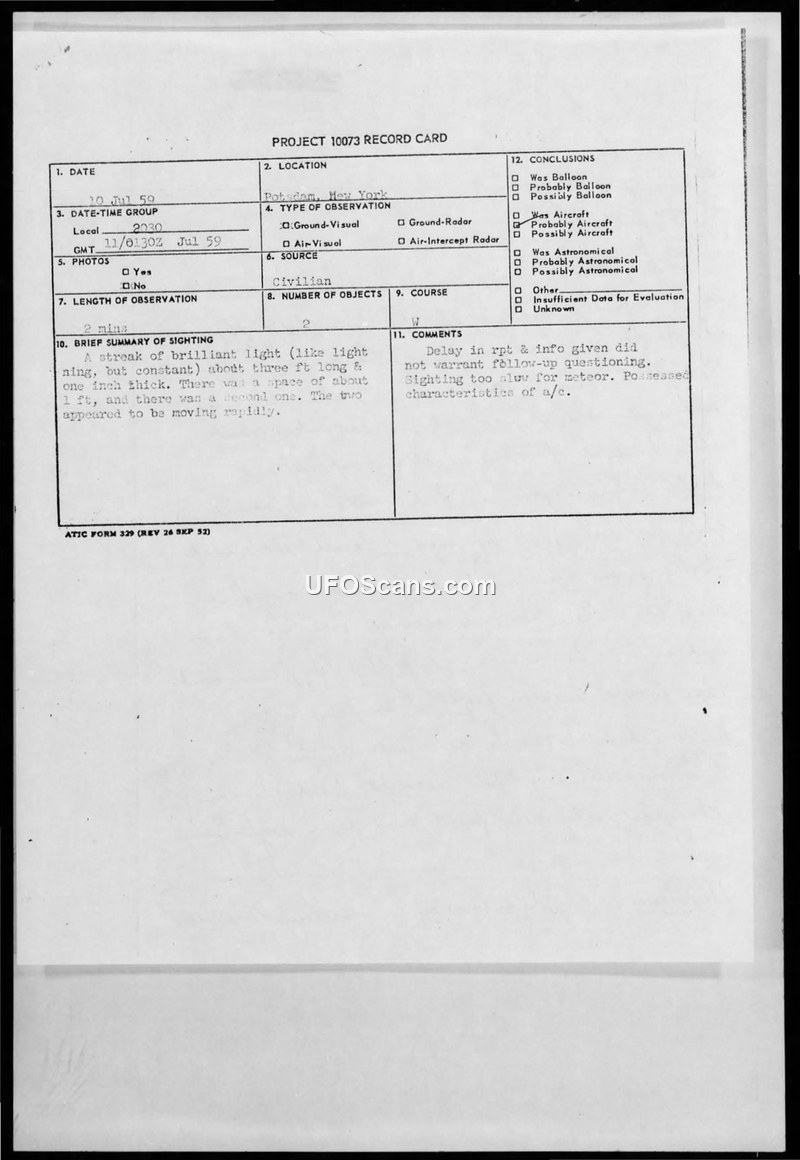 A civilian report of two bright, streak-like objects observed in Potsdam, New York, on July 10, 1959. ATIC concluded the objects were likely aircraft based on their speed and characteristics.