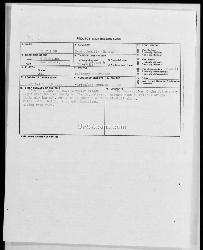 Project 10073 Record Card and Related Correspondence — Pacific Sighting, July 11, 1959