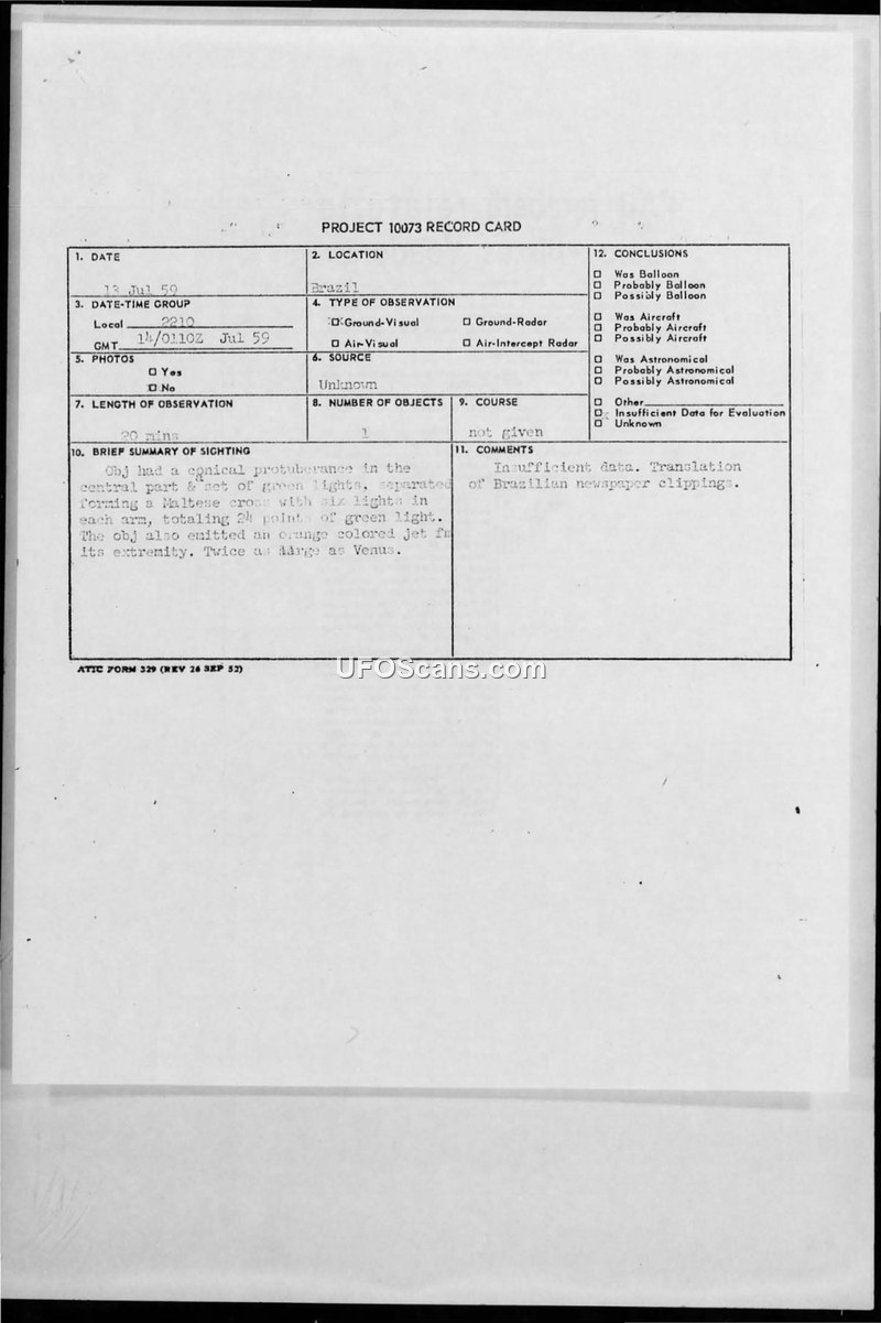 PROJECT 10073 RECORD CARD - Brazil Sighting