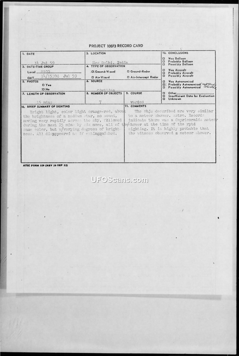 Project 10073 Record Card — New Delhi, India, 14 July 1959