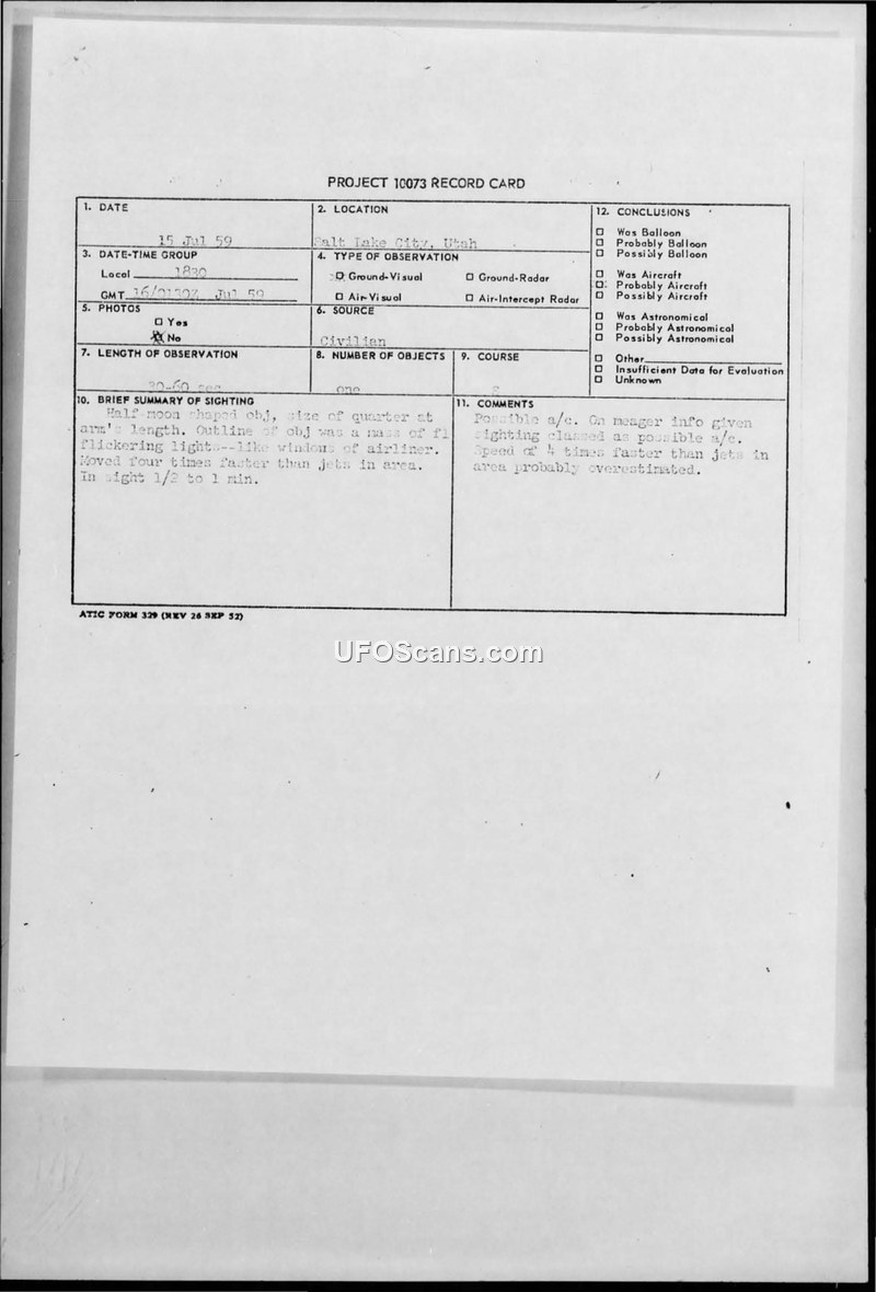 Project 10073 Record Card and UFO Report — Salt Lake City, Utah, 15 July 1959