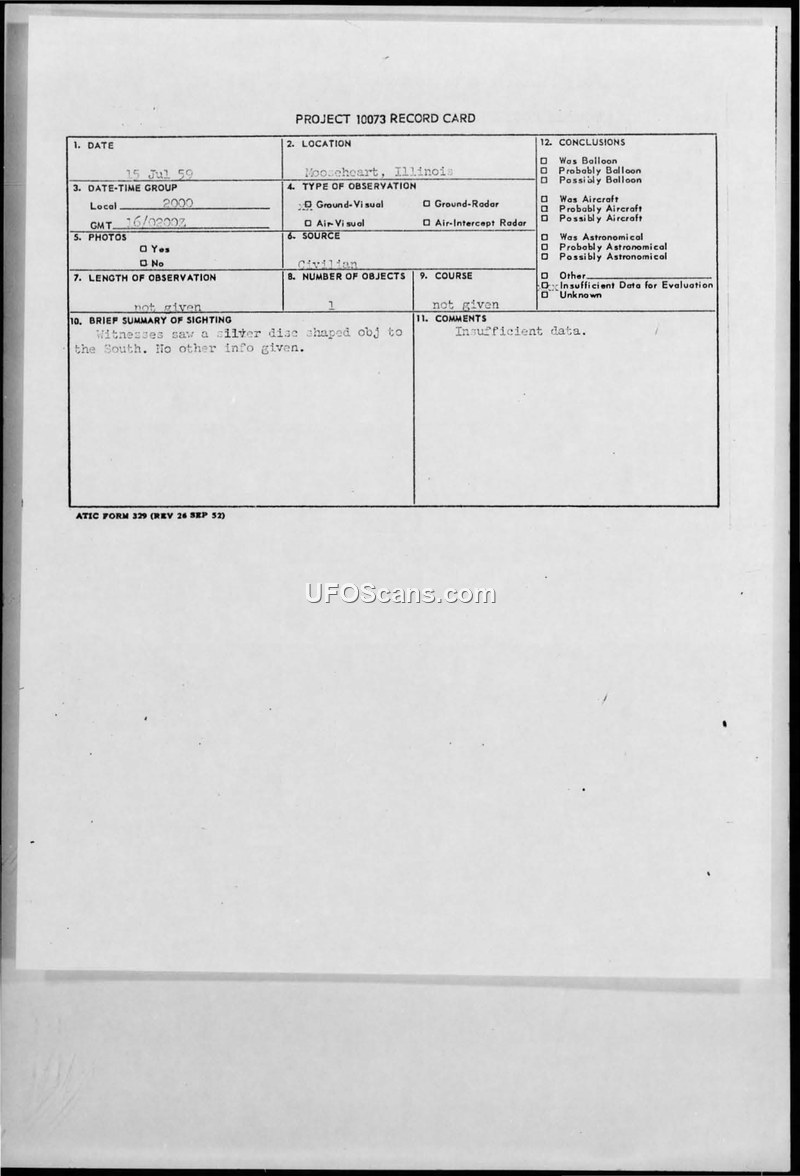 PROJECT 10073 RECORD CARD — Mooseheart, Illinois, 15 July 1959
