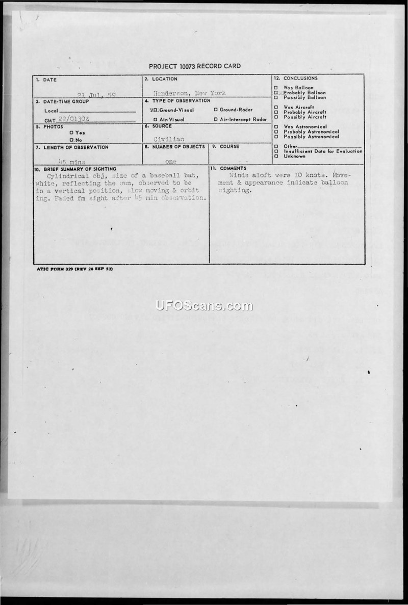 Project 10073 Record Card and Incident Report — Henderson, New York, July 1959