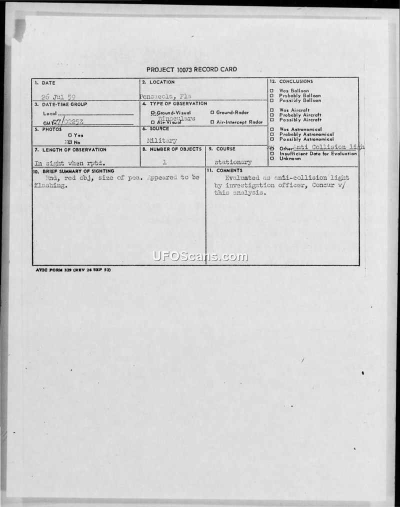 Project 10073 Record Card — Sighting at Pensacola, Florida, 26 July 1959