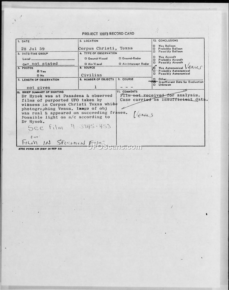 The film from the Corpus Christi sighting was evaluated by Dr. Hynek and Air Force personnel, both concluding the object was the planet Venus. Fragments submitted for analysis were determined to be common rock with no space residue.