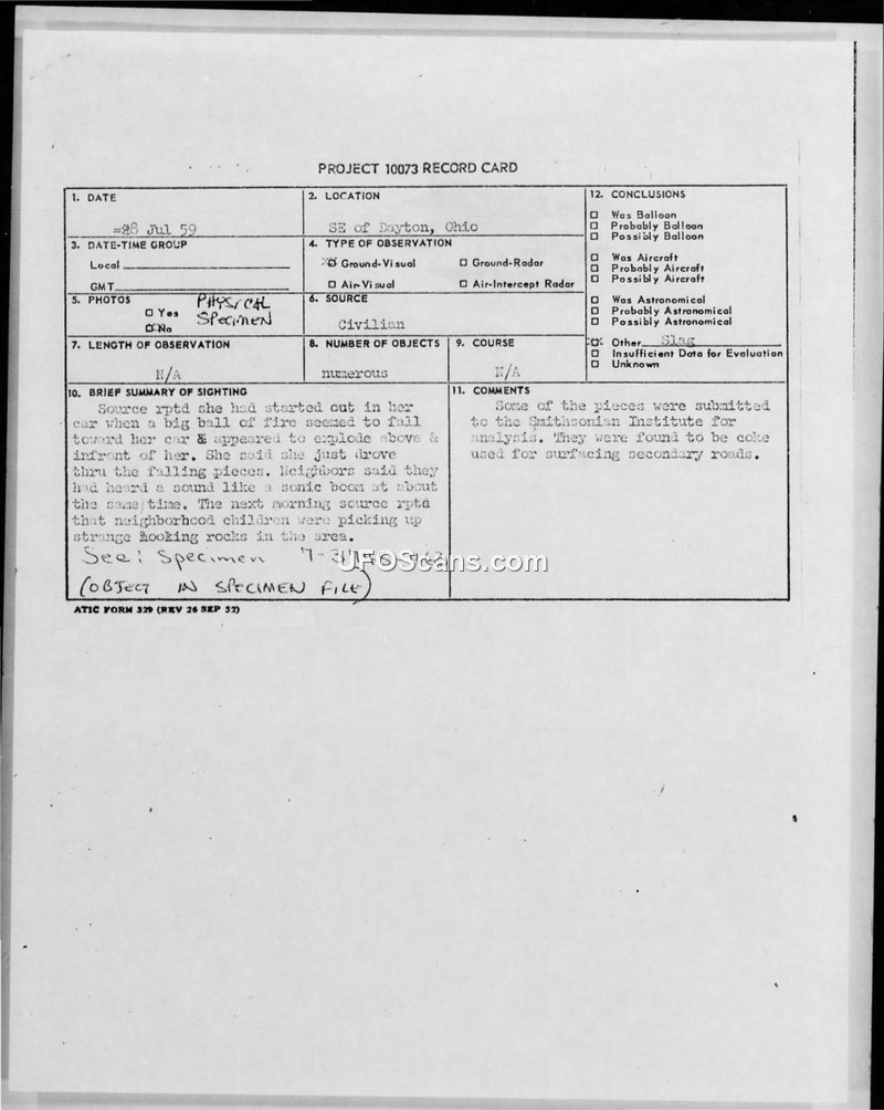 This document is a Project 10073 record card and associated field report detailing a sighting that occurred on the evening of July 28, 1952, southeast of Dayton, Ohio. A female witness reported that while driving, she observed a 'big ball of fire' that appeared to explode above and in front of her vehicle. She subsequently drove through the falling debris. A neighbor reported hearing a sound described as a 'sonic boom' at the time of the incident. The following morning, the witness reported that neighborhood children were picking up 'strange looking rocks' in the area, which caused the witness concern regarding potential radioactivity. On July 29, 1952, Major Friend and T/Sgt Bolien from Wright-Patterson Air Force Base (W-P AFB) were dispatched to investigate the report. The investigation involved the collection of physical samples, which were subsequently submitted to the Smithsonian Institute for analysis. The official conclusion reached by the analysis was that the recovered pieces were 'coke,' a material used for surfacing secondary roads. The document also includes handwritten notes regarding a hole found in the ground, approximately 7 or 8 inches deep, which appeared to have come from the southwest, and mentions an artifact number 341-11-475 located in the artifact room.