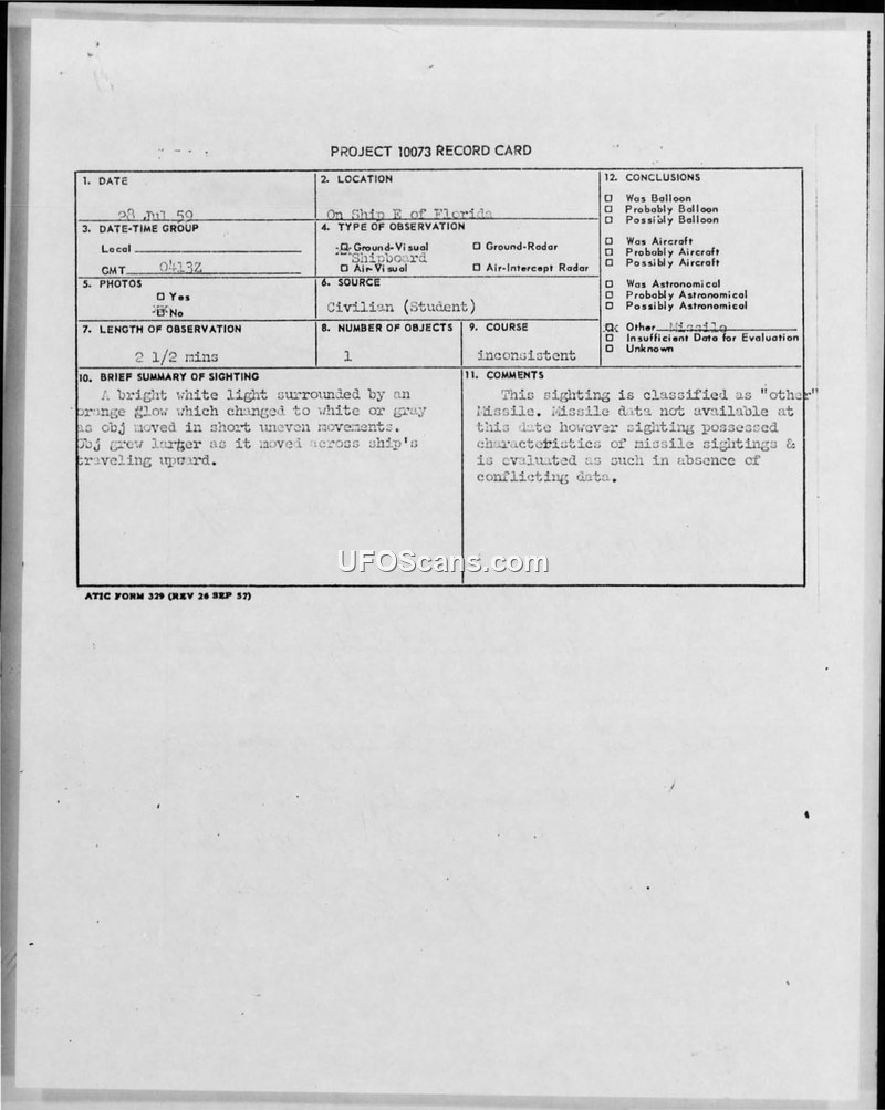 Project 10073 Record Card and Correspondence — U.S.S. Robinson Sighting, July 1959