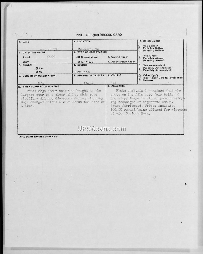A 1959 UFO sighting report from Coeburn, Virginia, involving a photograph that the Air Force determined to be a result of photographic artifacts (air bells) and poor development. The Air Force formally denied the witness's claim that a $100 reward existed for such photographs.