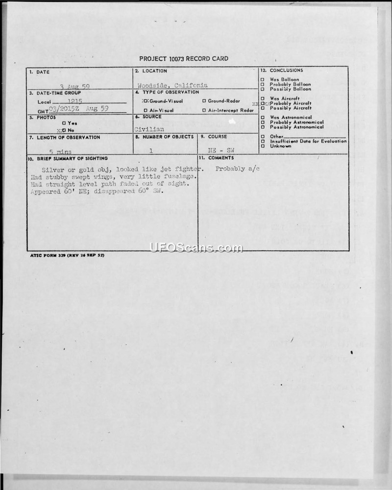 Correspondence and Reports Regarding UFO Sightings in California and Wisconsin (1959)
