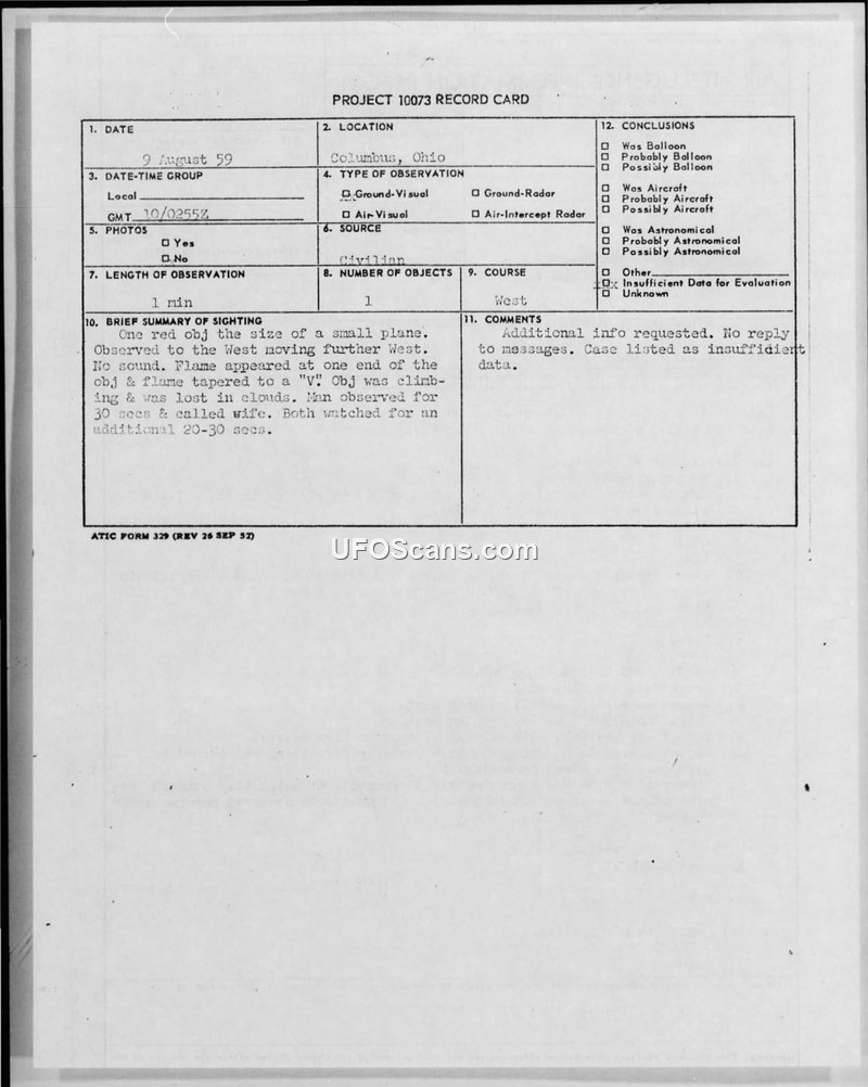 Project 10073 Record Card and Air Intelligence Information Report - Columbus, Ohio, 9 August 1959
