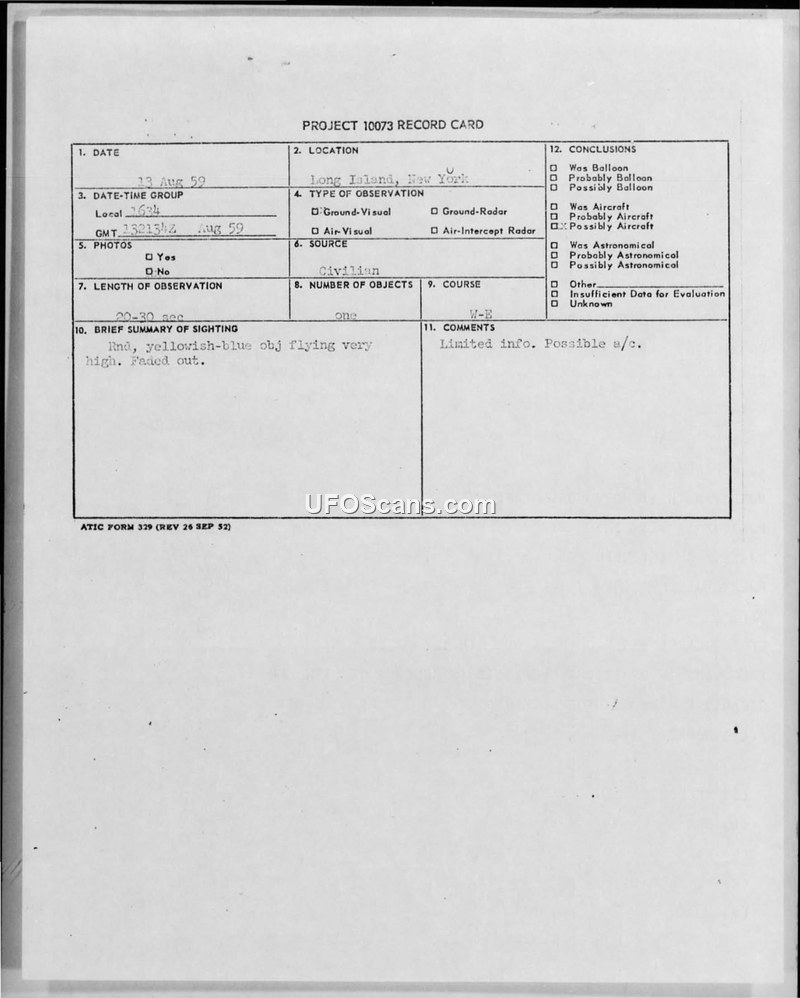 Project 10073 Record Card — Long Island, New York, 13 August 1959