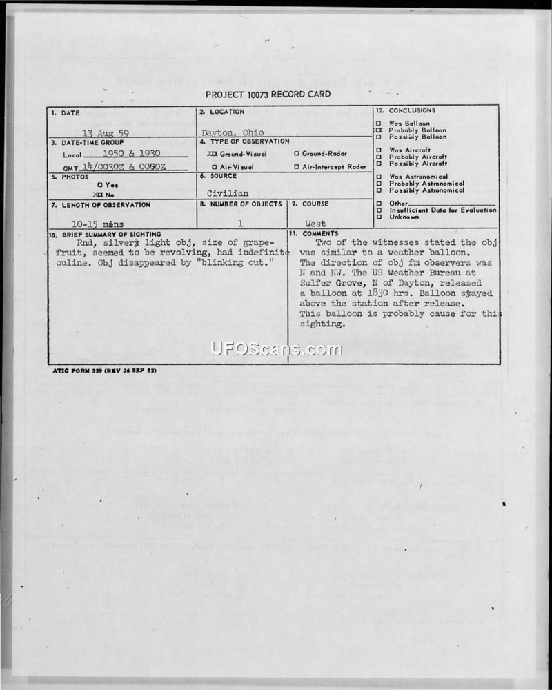 This document contains a series of Project 10073 record cards and U.S. Air Force Technical Information Sheets detailing UFO sightings reported in Dayton, Ohio, during August 1959. The primary reports concern two distinct incidents on August 13 and August 30, 1959. In the first instance, witnesses described a round, silvery object, approximately the size of a grapefruit, which appeared to be revolving and had an indefinite outline before 'blinking out.' The witnesses were interviewed by a Staff Duty Officer, who noted their sincerity and sobriety. Upon investigation, the officer determined that the US Weather Bureau at Sulfer Grove, north of Dayton, had released a weather balloon at 1830 hours, which remained in the area. The second incident, occurring on August 30, involved a similar silvery object observed drifting southeast over the city. This was also correlated with a weather balloon release at 2325Z. The documentation includes completed questionnaires from the witnesses, which provide details on their observations, including the lack of sound, the object's appearance, and the weather conditions at the time. The investigating officers systematically checked with local military installations, including Patterson AFB, Wright AFB, and the 56th FIS, to rule out aircraft activity. The consensus among the investigators was that the sightings were likely caused by weather balloons, as the flight paths and timing corresponded with known releases from the local weather station. The file also includes a summary list of sightings for September 1959, categorizing various reports across the United States as aircraft, astronomical phenomena, or unidentified.