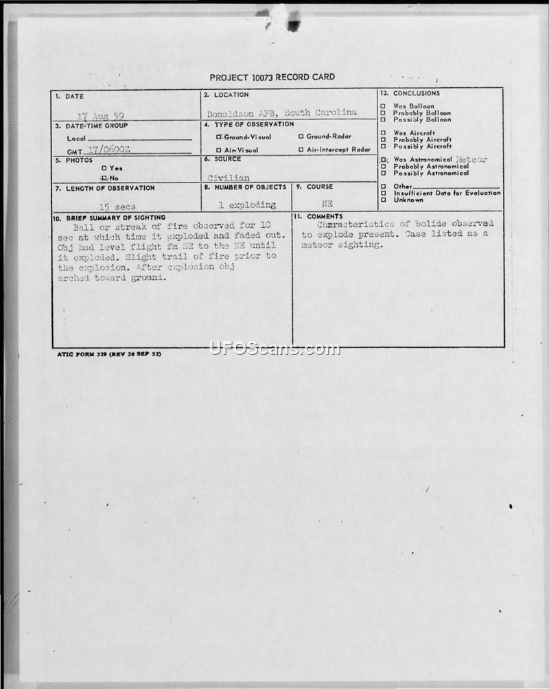 A civilian reported a bright, exploding aerial object near Donaldson AFB on August 17, 1959. The military investigation officially classified the event as a meteor sighting.