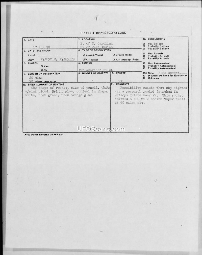 On August 17, 1959, a Pan American pilot reported an unidentified aerial object while flying. The sighting occurred at 0921Z, with the object described as conical in shape, approximately the size of a pencil, and exhibiting a bright glow that shifted from white to green to orange. The object was observed for 20 minutes, traveling from the southwest to the northeast. The pilot provided coordinates of 3752N 6957W. Military reports and subsequent news clippings confirm that this sighting coincided with the launch of a NASA research rocket from Wallops Island, Virginia. The rocket was part of a series of Nike research rockets designed to measure wind direction, velocity, and atmospheric diffusion. The rocket reached an altitude of approximately 50 miles, where it released a 100-mile-long sodium vapor trail. The trail, which appeared as a yellow-orange cloud, was visible over much of the eastern seaboard and was illuminated by the rising sun. The Air Technical Intelligence Center concluded that the reported object was indeed this research rocket.
