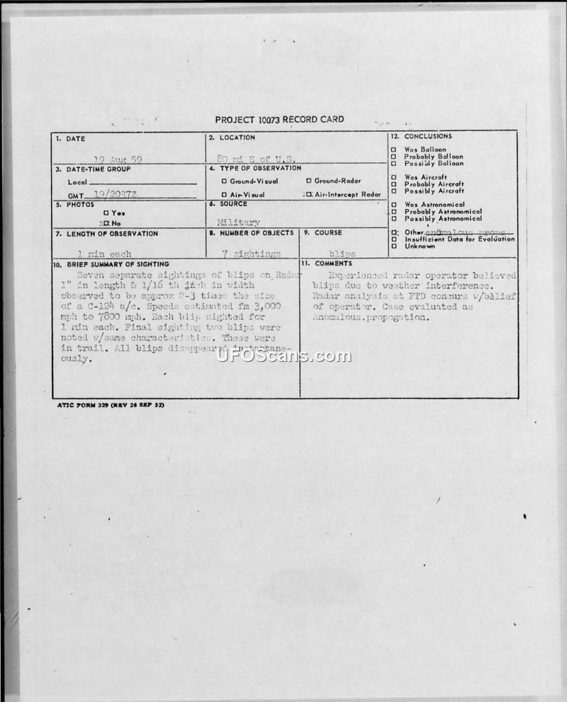 Project 10073 Record Card: Radar Sighting 19 August 1959