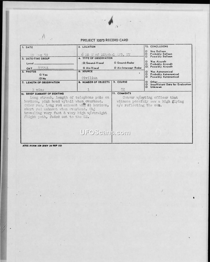 Project 10073 Record Card — 6 Miles West of Mitchel AFB, NY — 19 August 1959