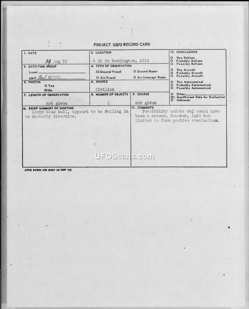 A civilian in Newfoundland reported a large blue ball falling in an easterly direction on August 14, 1959. The military investigation concluded there was insufficient data to identify the object, suggesting it might have been a meteor.
