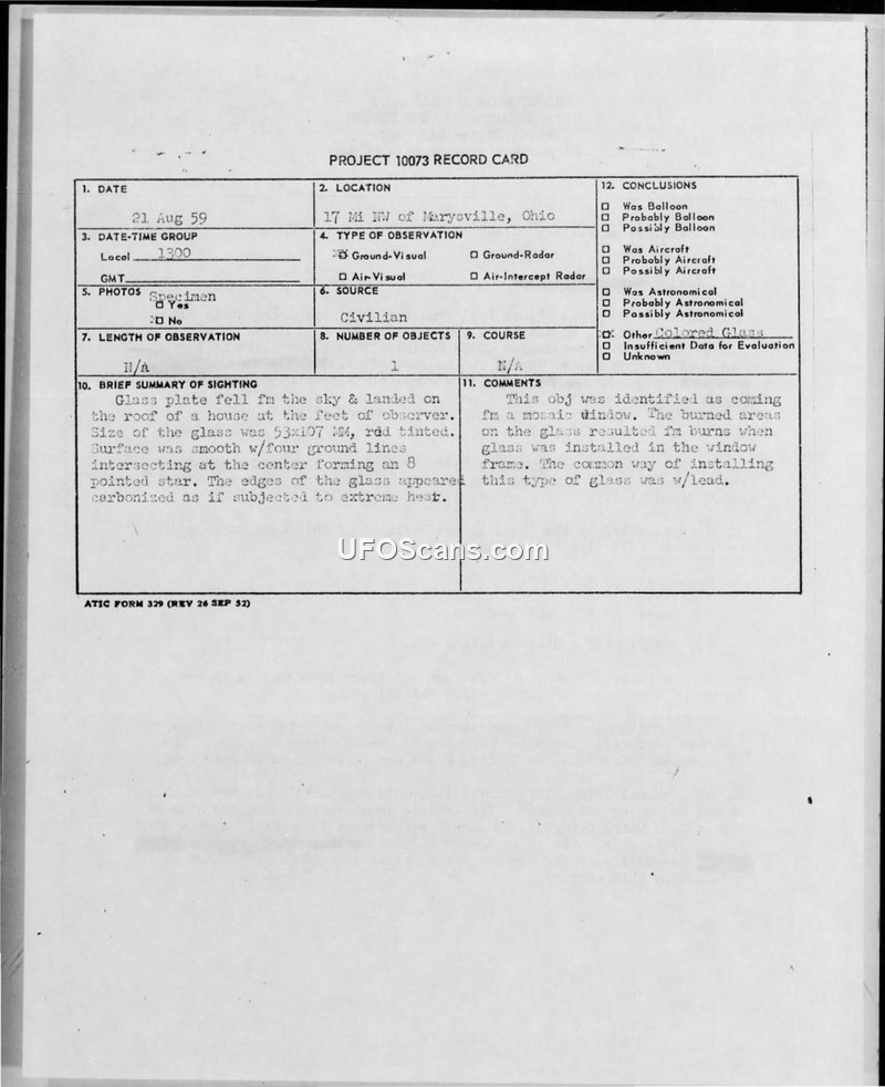 On 21 August 1959, at approximately 1300 hours, a red-tinted glass plate fell from the sky and landed on the roof of a house 17 miles northwest of Marysville, Ohio. The witness, Arnold Wiley, reported that there were no aircraft in sight and he heard no sound prior to the object's arrival. The object was recovered and turned over to the local County Civilian Defense head, Robert Gordon, who subsequently provided it to the Intelligence Division of the 376th Bombardment Wing at Lockbourne Air Force Base. The object measured 53 by 107 millimeters and featured a smooth surface with four ground lines intersecting at the center to form an eight-pointed star. It was found broken into three pieces with carbonized edges, suggesting exposure to extreme heat. The local newspaper, The Journal Tribune, published a report on the incident on 24 August 1959, though it incorrectly identified the date of the fall as 22 August. An investigation by T/Sgt Charles E. Robinson of the 376th Armament and Electronics Squadron concluded that the item was a 'water house stop' used in 0-23 or 0-22 radar recording cameras. Such components are used in diaphragms to regulate light exposure for high-altitude, high-speed aerial photography. The carbonization and apparent melting were attributed to air friction generated by high-speed flight or a free fall from extreme altitudes. Personnel at North American Aircraft in Columbus, Ohio, confirmed that their aircraft did not utilize this specific equipment. Colonel Vitunak at Wright Patterson Air Force Base advised that the glass be forwarded for further examination. The 376th Bombardment Wing requested the final determination of the object's source so that a letter of appreciation could be sent to the finder, and noted that the local press had requested further information for a follow-up story regarding procedures for reporting future findings.