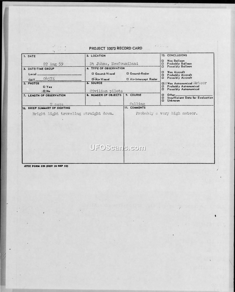Project 10073 Record Card — St Johns, Newfoundland, 22 Aug 59