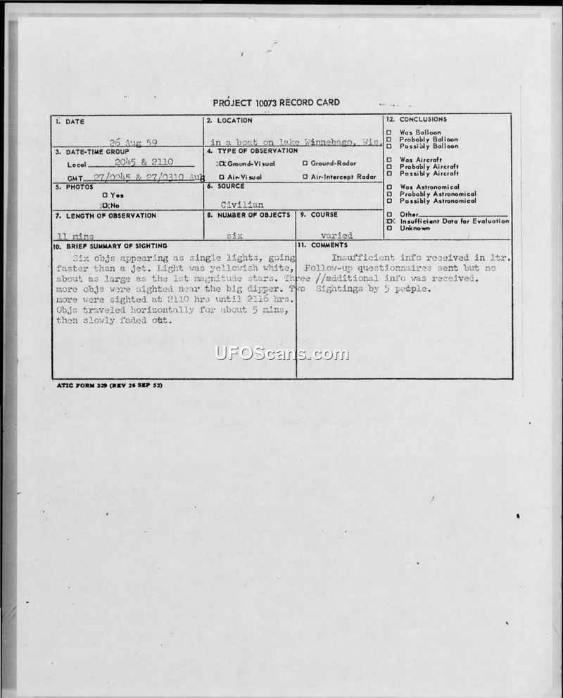 A group of five witnesses reported six unidentified lights over Lake Winnebago, Wisconsin, on August 26, 1959. The Air Force determined the initial report lacked sufficient data and requested formal questionnaires from the witnesses.