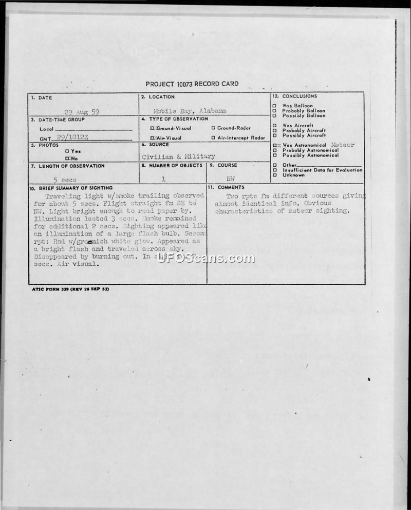 An Air Force navigator reported a bright, greenish-white object in the night sky over Louisiana on August 29, 1959. Military investigations found no radar or air traffic evidence, leading officials to conclude it was likely a missile, satellite, or celestial body.