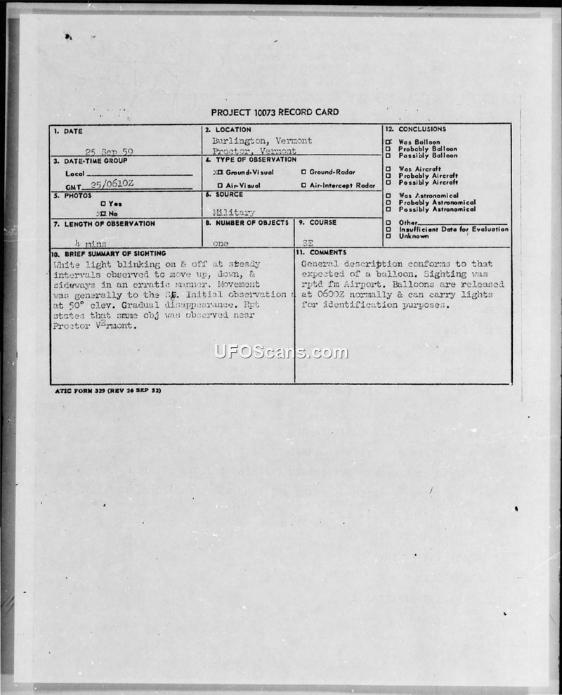 A UFO sighting report from 25 September 1959 near Burlington, Vermont, involving a blinking white light. The Air Force concluded the object was likely a weather balloon, though local operations command initially reported no known cause.
