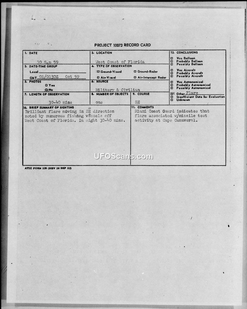 A brilliant flare was observed by multiple fishing vessels off the Florida coast on September 30, 1959. The Air Force concluded the object was a flare related to missile testing at Cape Canaveral.