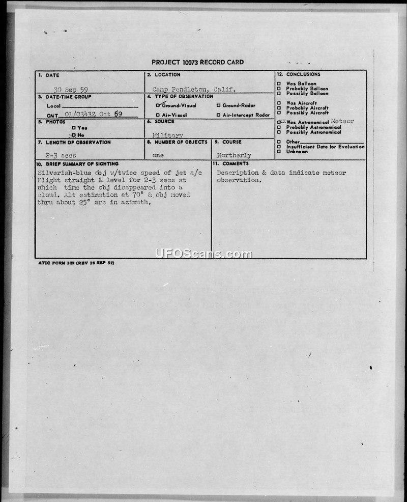 A UFO sighting at Camp Pendleton on September 30, 1959, was officially identified as a meteor. The report includes detailed witness observations and meteorological data.