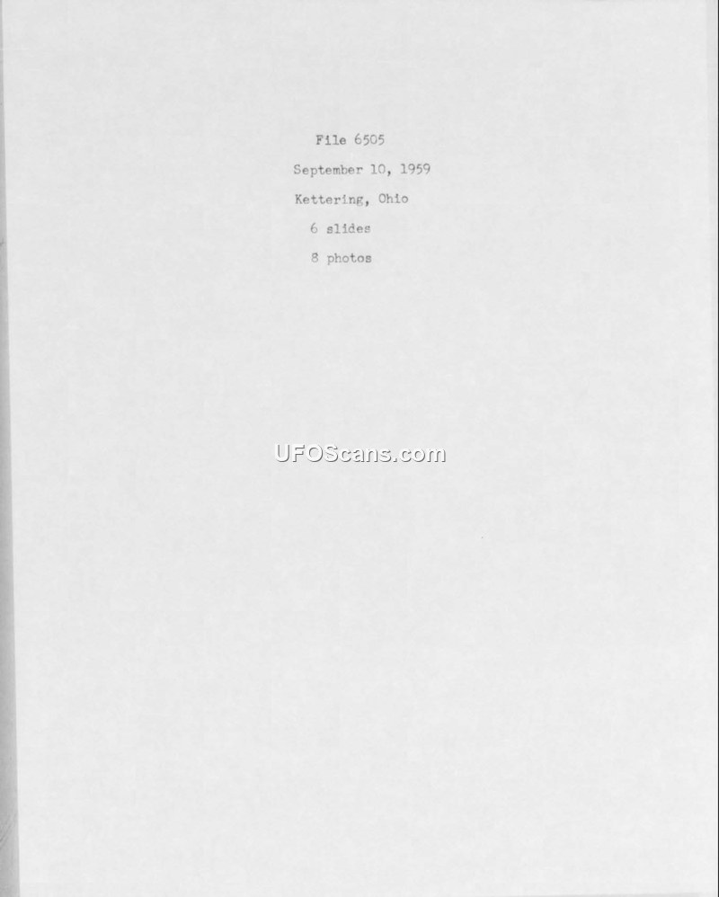 This document is a photographic record of a UFO sighting near Wake Island on September 9, 1959. It includes eight photographs and six slides cataloged under File 6505 by the Foreign Technology Division.
