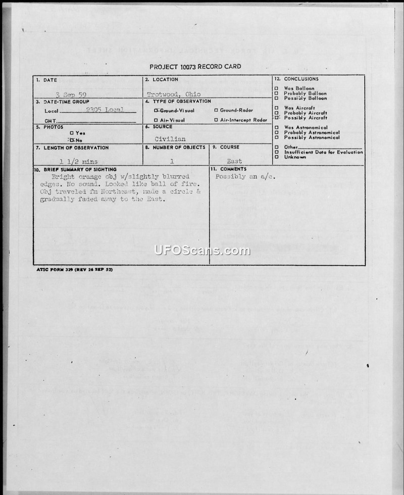 Project 10073 Record Card — Trotwood, Ohio, 3 Sep 59