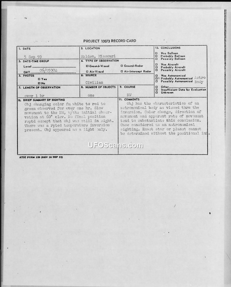 Project 10073 Record Card — Malden, Missouri, 5 September 1959