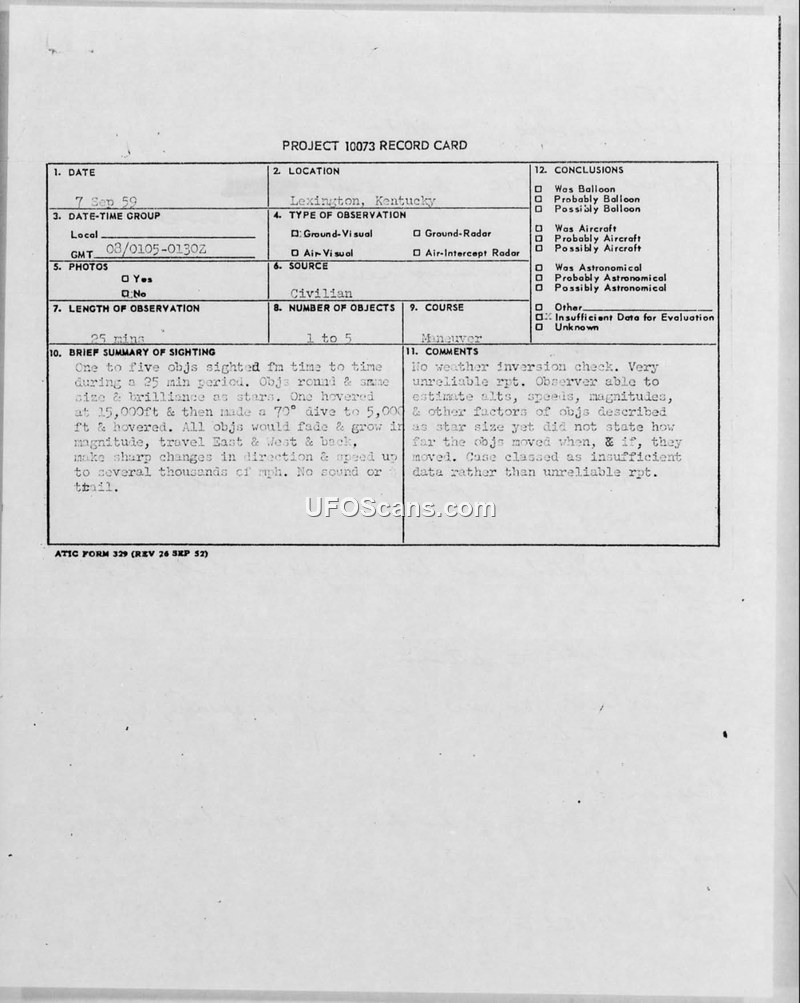 PROJECT 10073 RECORD CARD — Lexington, Kentucky, 7 Sep 59